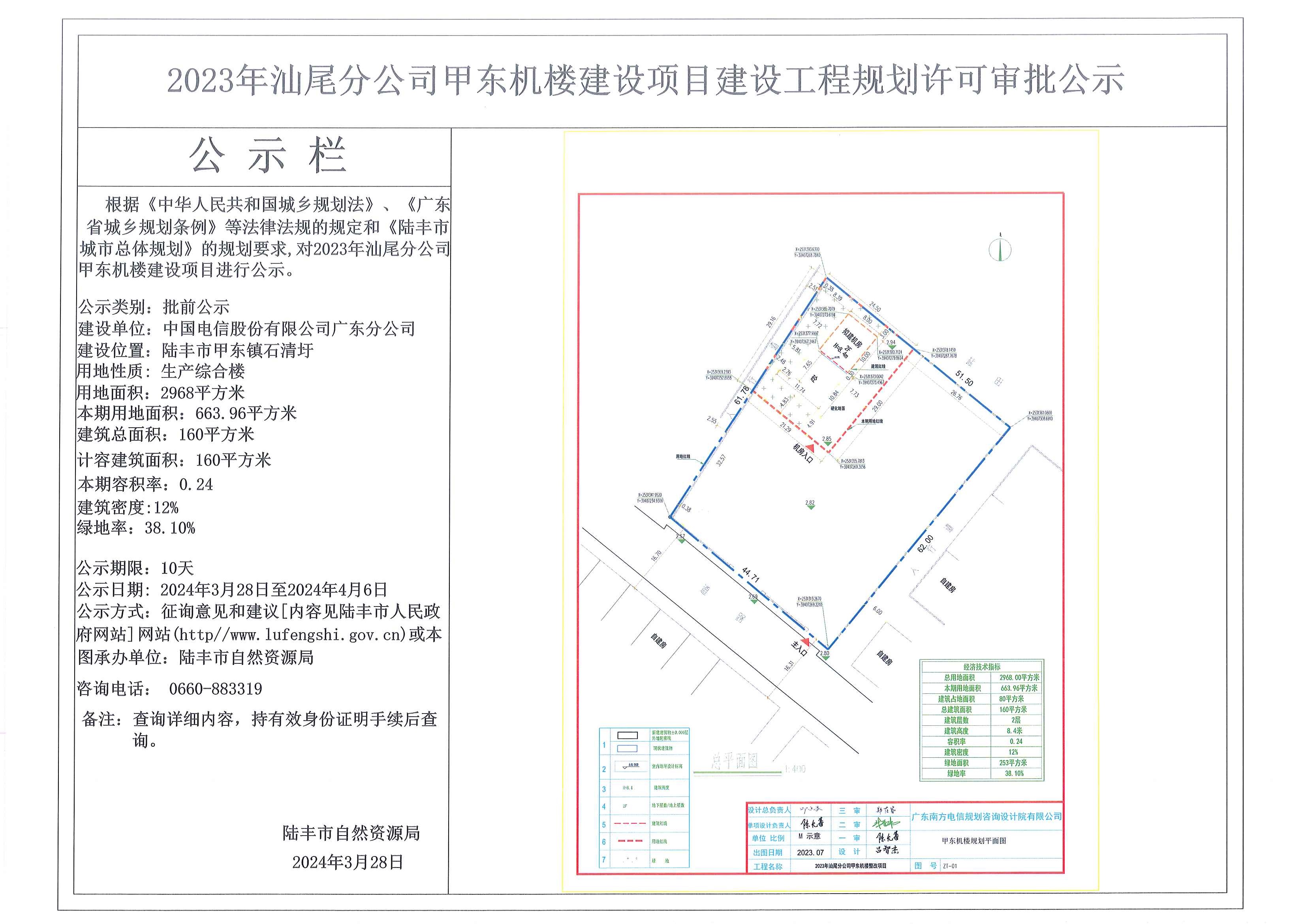 2023年汕尾分公司甲東機樓建設項目建設工程規(guī)劃許可審批公示