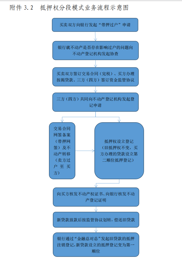 3.抵押權(quán)分段模式:通過(guò)借新貸、過(guò)戶后(舊抵押權(quán)不變)并還舊貸實(shí)現(xiàn)“帶押過(guò)戶”的,不動(dòng)產(chǎn)登記機(jī)構(gòu)根據(jù)申請(qǐng)按序?qū)⒔灰缀贤W(wǎng)簽備案及不動(dòng)產(chǎn)轉(zhuǎn)移(賣方過(guò)戶至買方)、抵押權(quán)設(shè)立(買方新辦理的按揭貸款設(shè)立第二順位抵押權(quán))合并辦理。